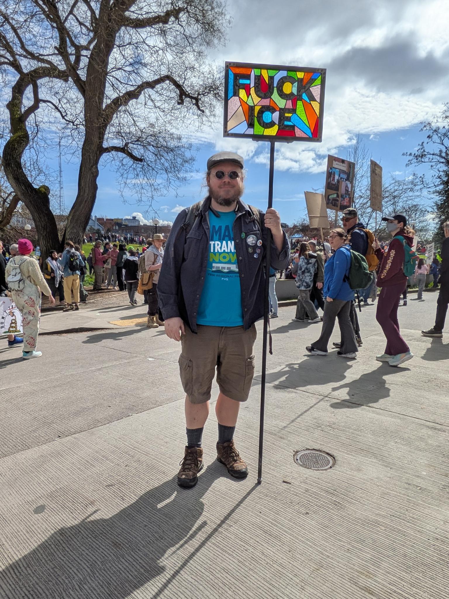 Matthew Dockrey - Matthew holding the FUCK ICE Sign at No Kings 3 - Stained Glass and Metal - March 2026