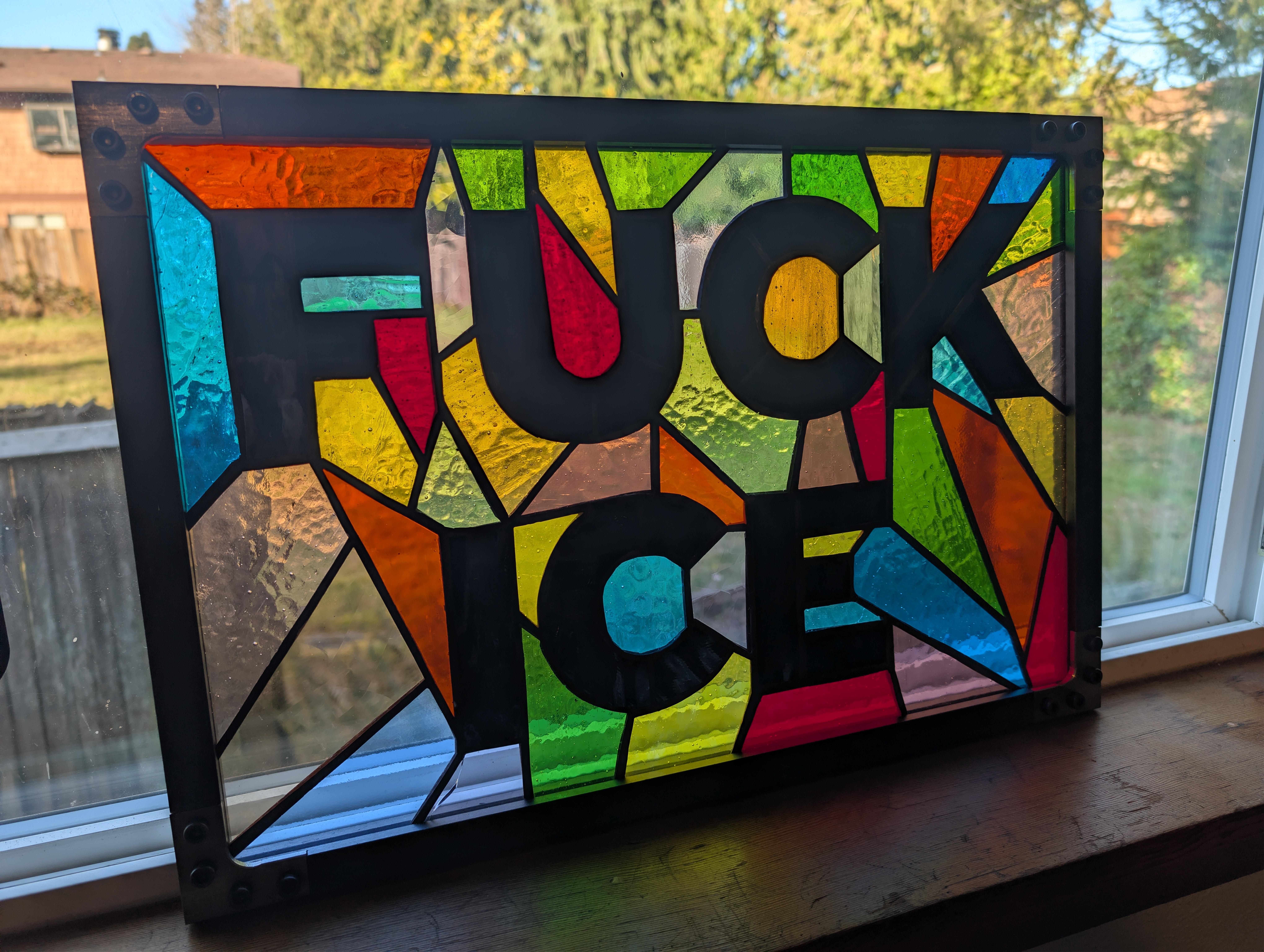 Matthew Dockrey - FUCK ICE Sign Shine Through - Stained Glass and Metal - March 2026
